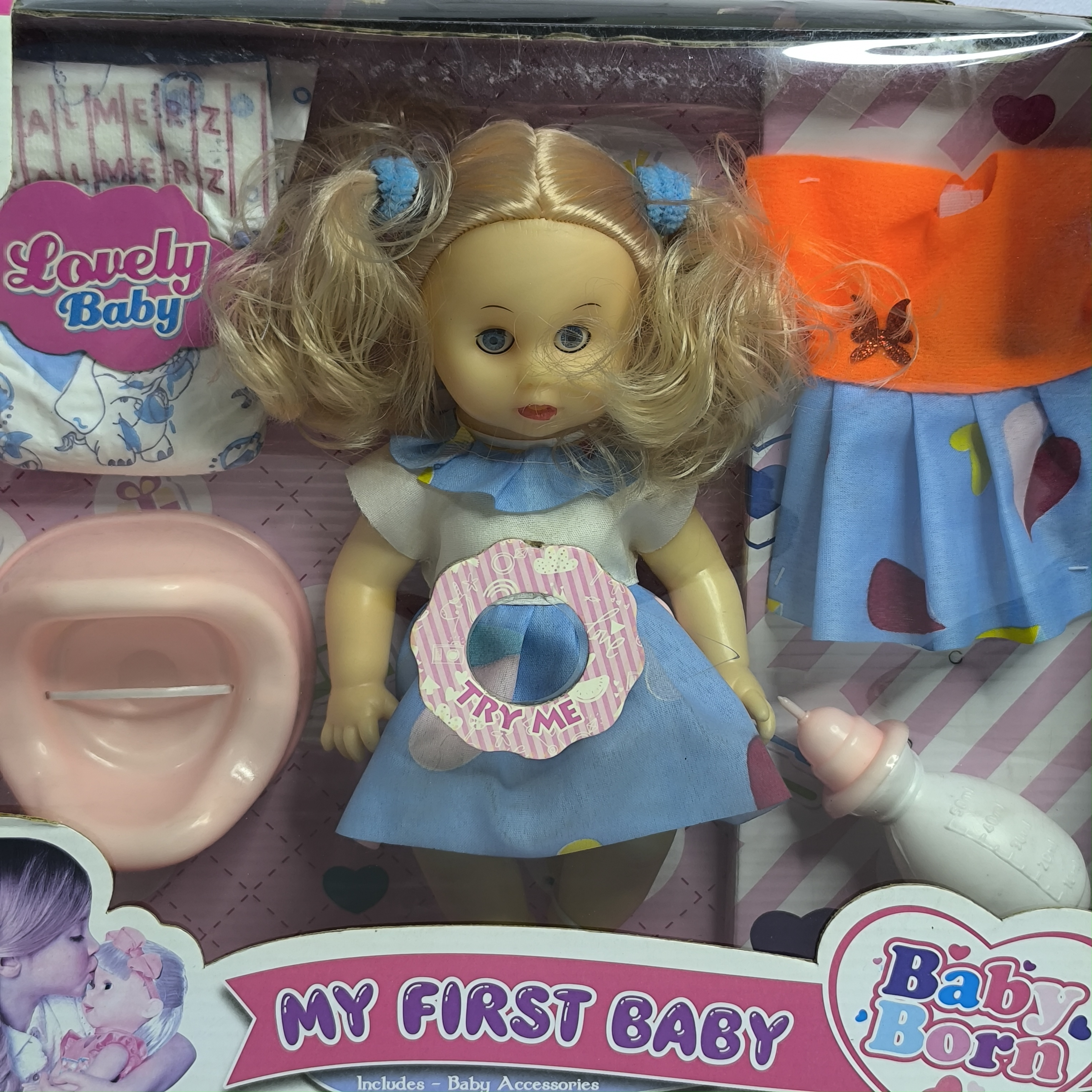عروسک بیبی بورن با ظرف غذا و لوازم آرایشی موزیکال